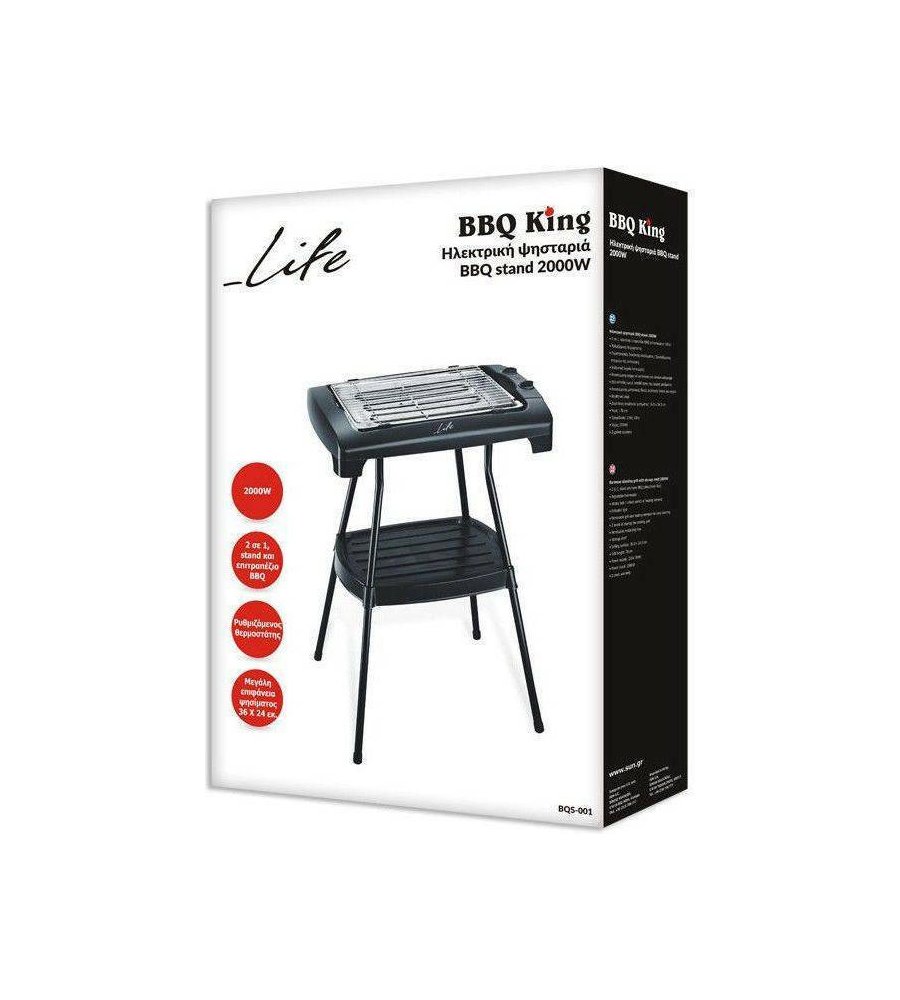 Η BBQ King σου δίνει το αποτέλεσμα ενός μπάρμπεκιου κάρβουνου ή υγραερίου, ενώ το μόνο, που χρειάζεται είναι να τη συνδέσεις στο ρεύμα,Διαθέτει μεγάλη επιφάνεια ψησίματος διαστάσεων 36 x 24 cm, η οποία σου επιτρέπει να ψήσεις μεγάλη ποσότητα κρεάτων και λαχανικών ταυτόχρονα, ενώ παράλληλα διαθέτει ρυθμιζόμενο θερμοστάτη, για να ψήνεις στην θερμοκρασία, που εσύ προτιμάς. Επίσης, έχεις τη δυνατότητα να τοποθετήσεις τη σχάρα ψησίματος σε δύο επίπεδα ύψους. Η LIFE BBQ King μπορεί να χρησιμοποιηθεί είτε ως stand είτε ως επιτραπέζια ψησταριά, χάρη στα αποσπώμενα πόδια, που διαθέτει. Το καθάρισμά της γίνεται πανεύκολα, χάρη στην αποσπώμενη σχάρα και στον αποσπώμενο μεταλλικό δίσκο συλλογής λίπους και υγρών.
