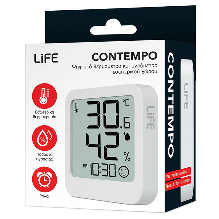 Θερμόμετρo/υγρασιόμετρo της εταιρείας Life το οποίο είναι ιδανική επιλογή για να είστε ενήμεροι σχετικά τόσο με την τρέχουσα θερμοκρασία, όσο και για τη σχετική υγρασία σε έναν συγκεκριμένο χώρο. Μπορείτε να το τοποθετήσετε εσωτερικά σε οποιοδήποτε δωμάτιο του χώρου σας. Η παρακολούθηση της θερμοκρασίας και της υγρασίας μπορεί να σας είναι σημαντική για διάφορους λόγους, όπως για να γνωρίζετε ανά πάσα στιγμή την ακριβή απόδοση ενός συστήματος θέρμανσης ή ψύξης ή ακόμα και για παραμείνετε ενήμεροι απλά για τις συνθήκες που επικρατούν.